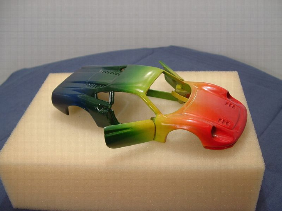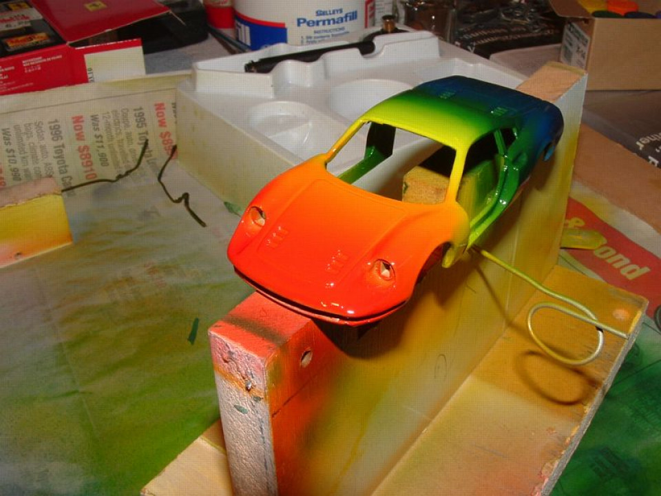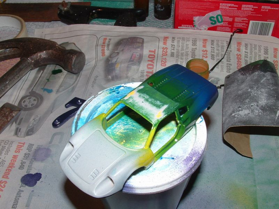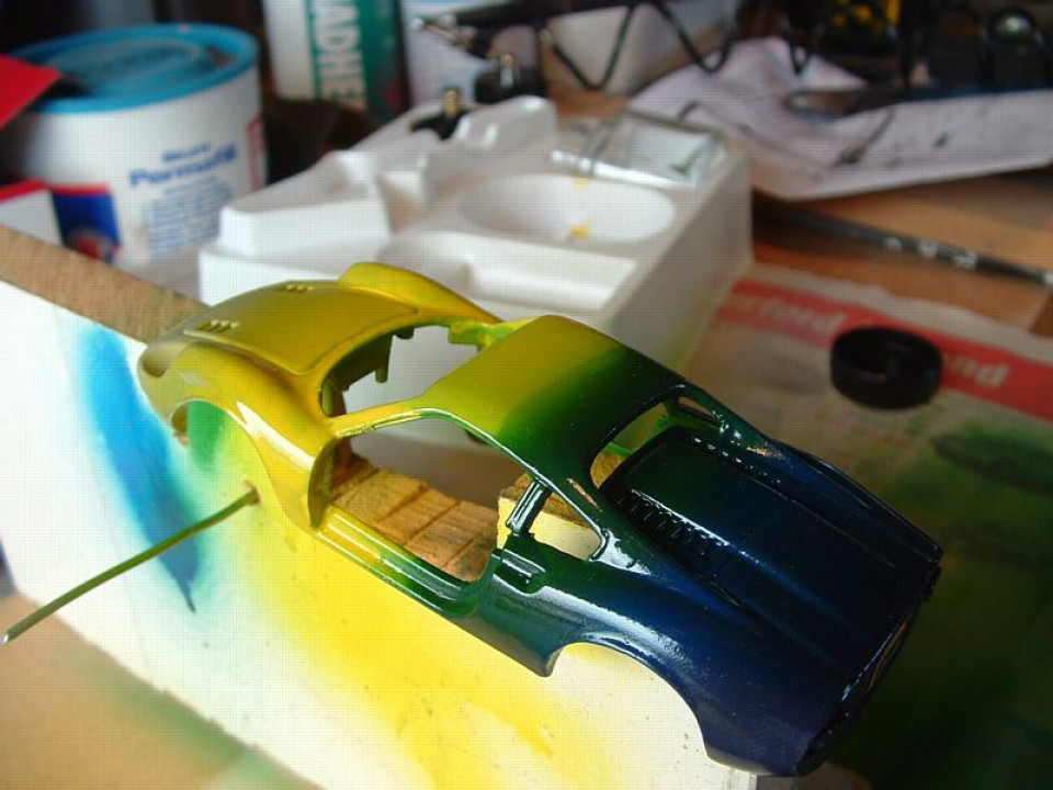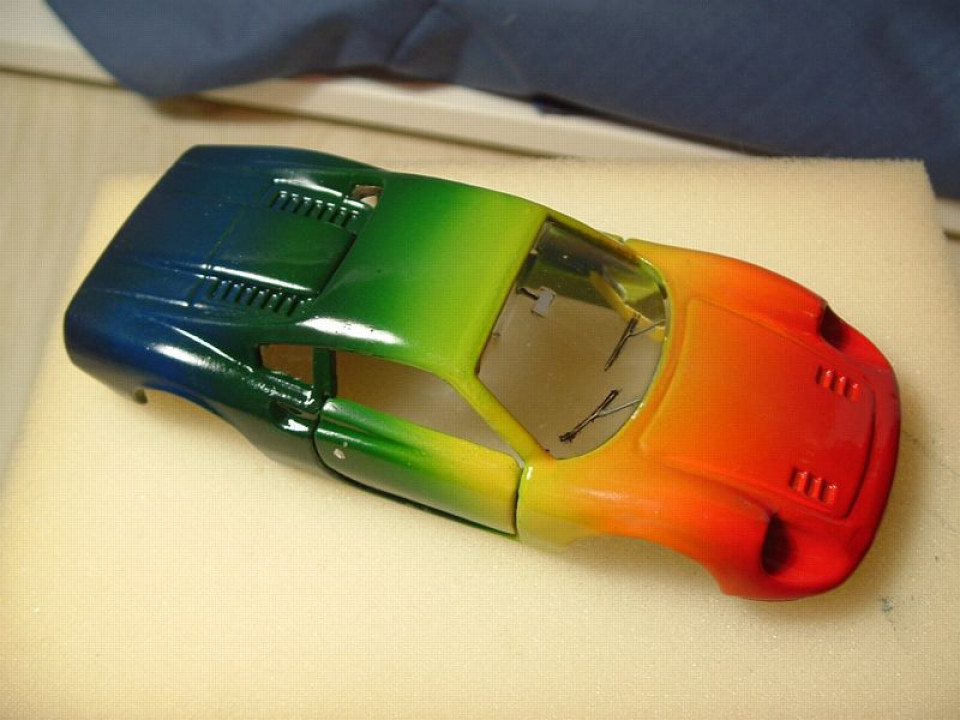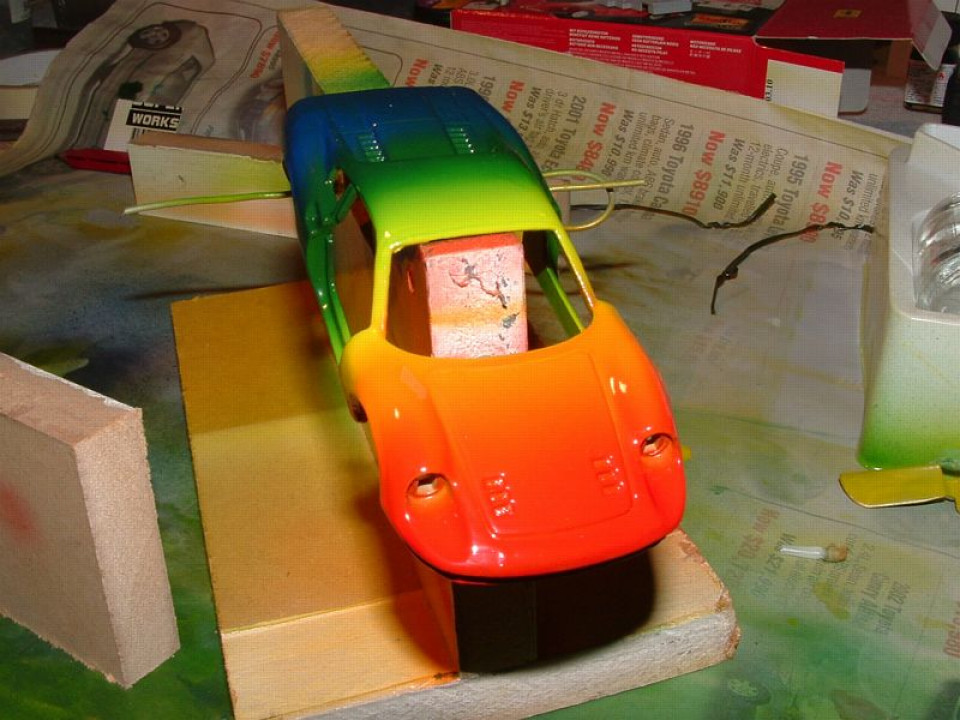 So now it was on to the real task - finish coats! Now at this point I want to stress that this was the first time EVER I had tried using a proper mini spray painter. Sure I've used cans before on bigger models, but here I was trying to spray a rainbow on a 1:43 scale car!