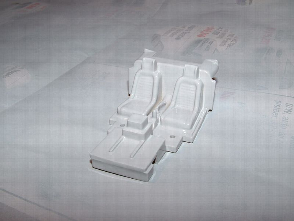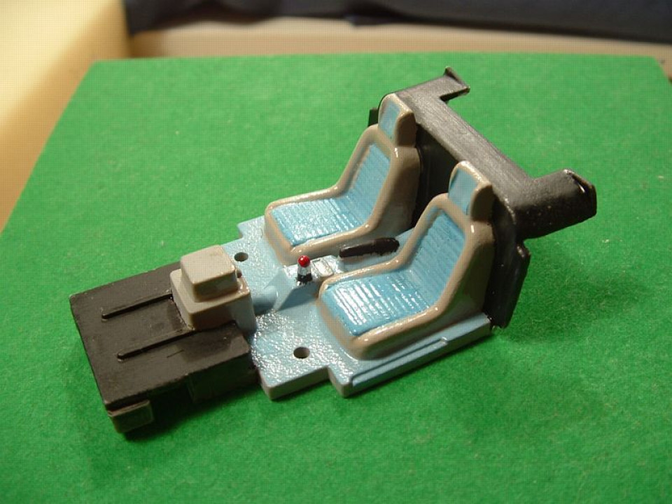 Next I used an undercoat/primer to cover the original paint work on the model. I also applied this, using a hobby-type air sprayer, to the interior fittings. To speed up the process I VERY CAREFULLY applied heat from a paint stripper air gun to the metal casting, moving it continuously so that the model would not overheat and warp. Occasional touches with the back of the hand assured me the metal was not getting too hot.