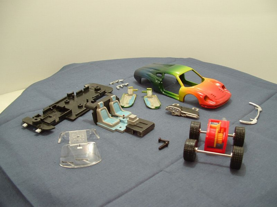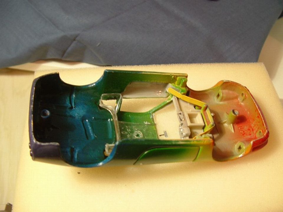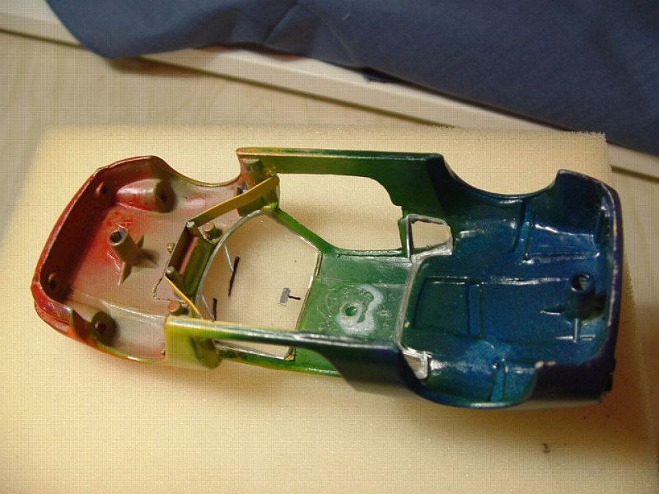 Having built the kit and having been struck by conscience I decided to completely dismantle the kit to its components. This entailed removing the baseplate and pull-back motor, removing the axles and wheels, removing the interior, leaving me with the die cast metal body to take apart.