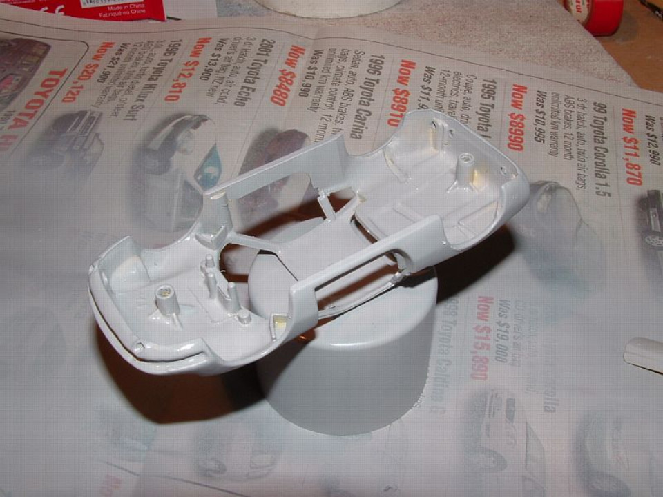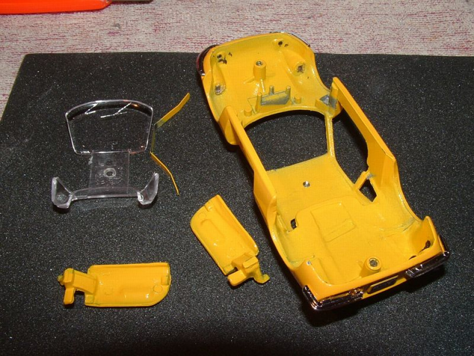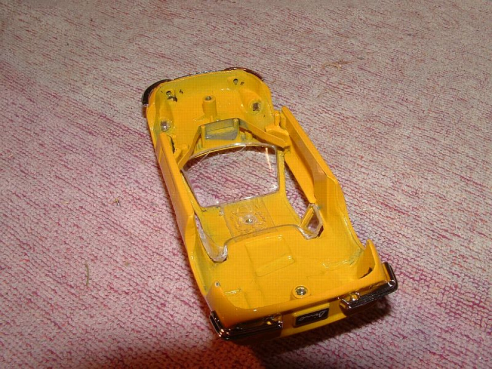 Removing the doors was the easy part! But this left me with a body shell still containing its windscreen, bumpers and light lenses. With careful attention I drilled out the rivet holding in the windscreen and then, with a very sharp knife, I removed the plastic welded "rivets" that held in the front and rear light lenses and the bumpers. These were put aside for replacement when the job was done. I then masked out the rear number plate as I wanted to retain that on the finished model and it was just a paper based sticker.
