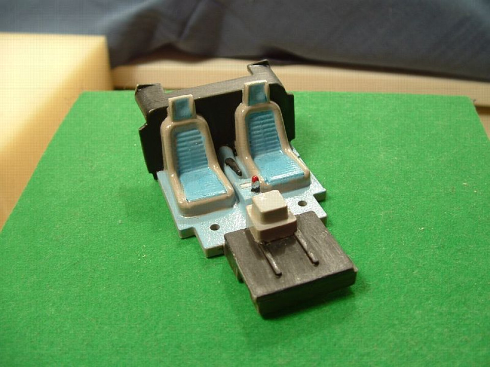 I now turned my attention to the interior. This was brush painted using Humbrol and Tamiya paints. I used matt black for the rear parcel shelf, plus the front housing that doesn't show when the model is assembled. A light grey was used for the seats with blue inserts. The carpets were painted blue and the steering wheel and brake lever were also picked out in silver, black, and red. Although the photos don't show it, the finished edges are not as rough as they appear here.
